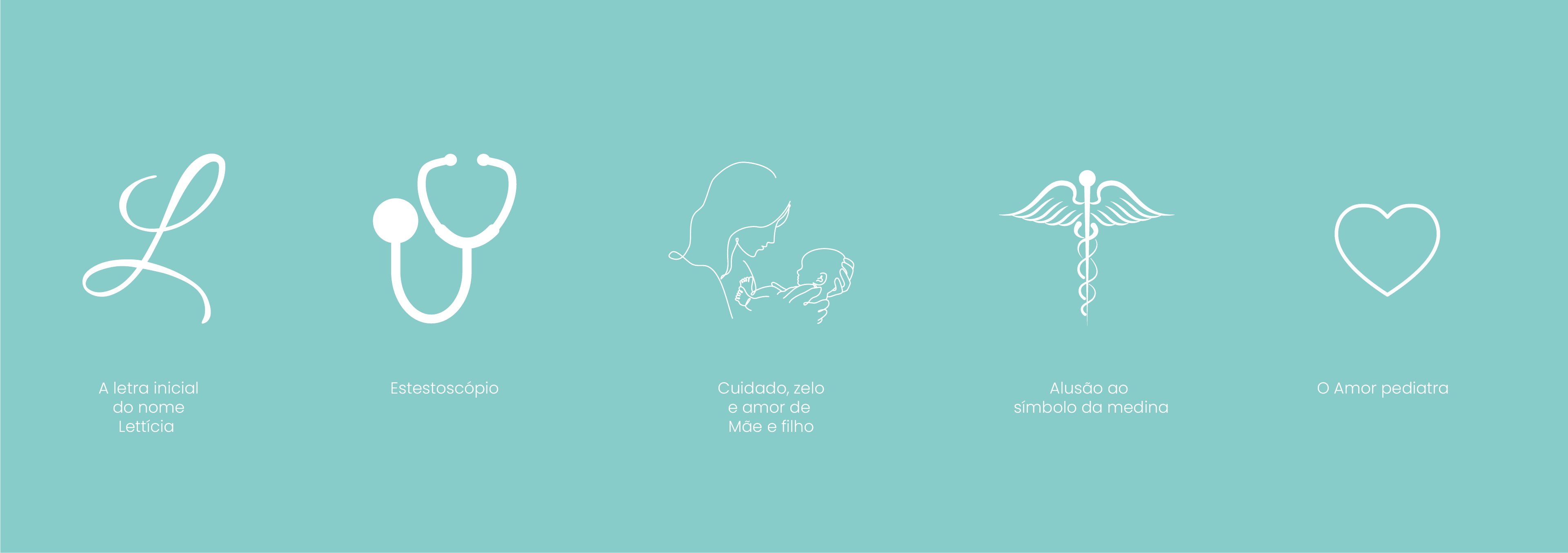 A composição do logo da Dra. Leticcia Vanini foi pensada para transmitir sua personalidade e os valores de sua profissão. O primeiro símbolo é a letra “L”, inicial do seu nome, que transmite proximidade e personalização. O segundo símbolo é o estetoscópio, ícone na medicina, que representa sua expertise na área da pediatria. O terceiro símbolo é a representação do cuidado, amor e zelo que ela tem com seus pacientes. O quarto símbolo é a alusão ao símbolo da medicina, que transmite confiança e segurança. E o quinto e último símbolo é o amor, que é o sentimento que norteia toda a sua prática médica.